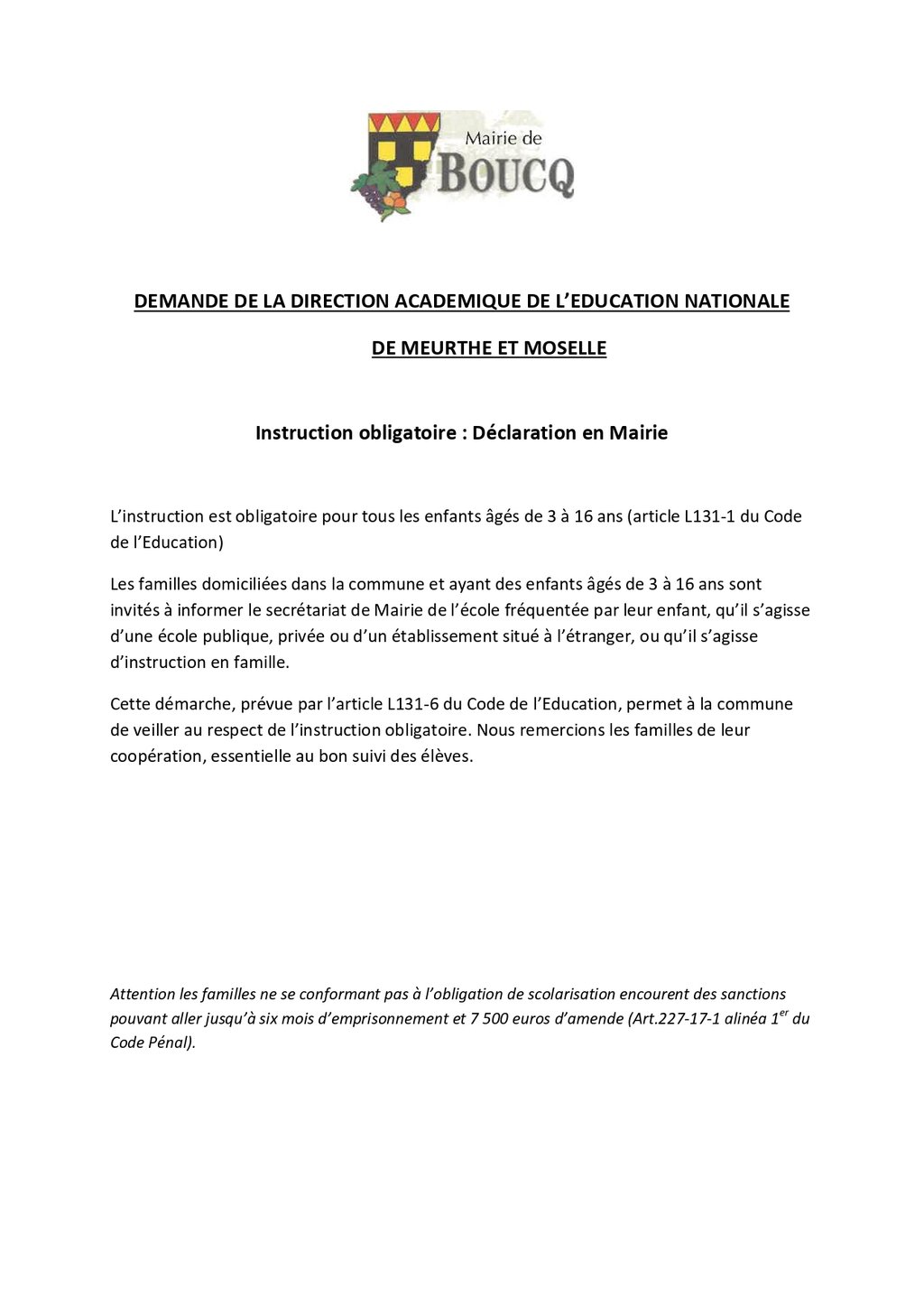 DEMANDE DE LA DIRECTION ACADÉMIQUE : DÉCLARATION EN MAIRIE